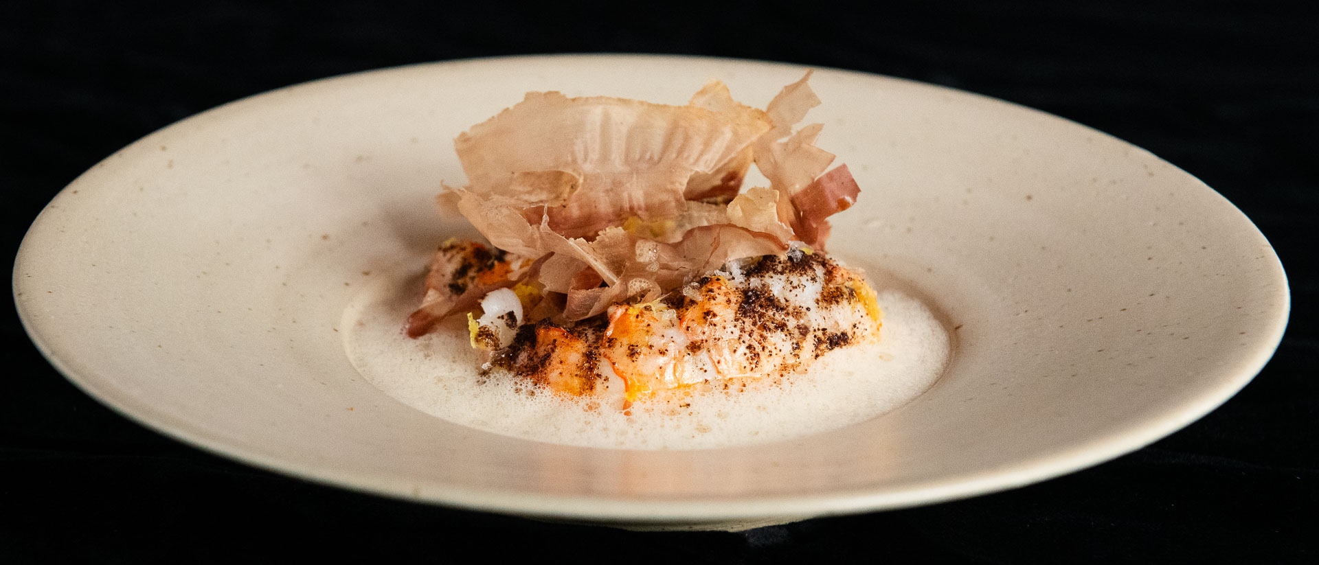 - Langoustine gegaard in eendenvet met dashi-Albuférasaus, koffie en katsuobushi