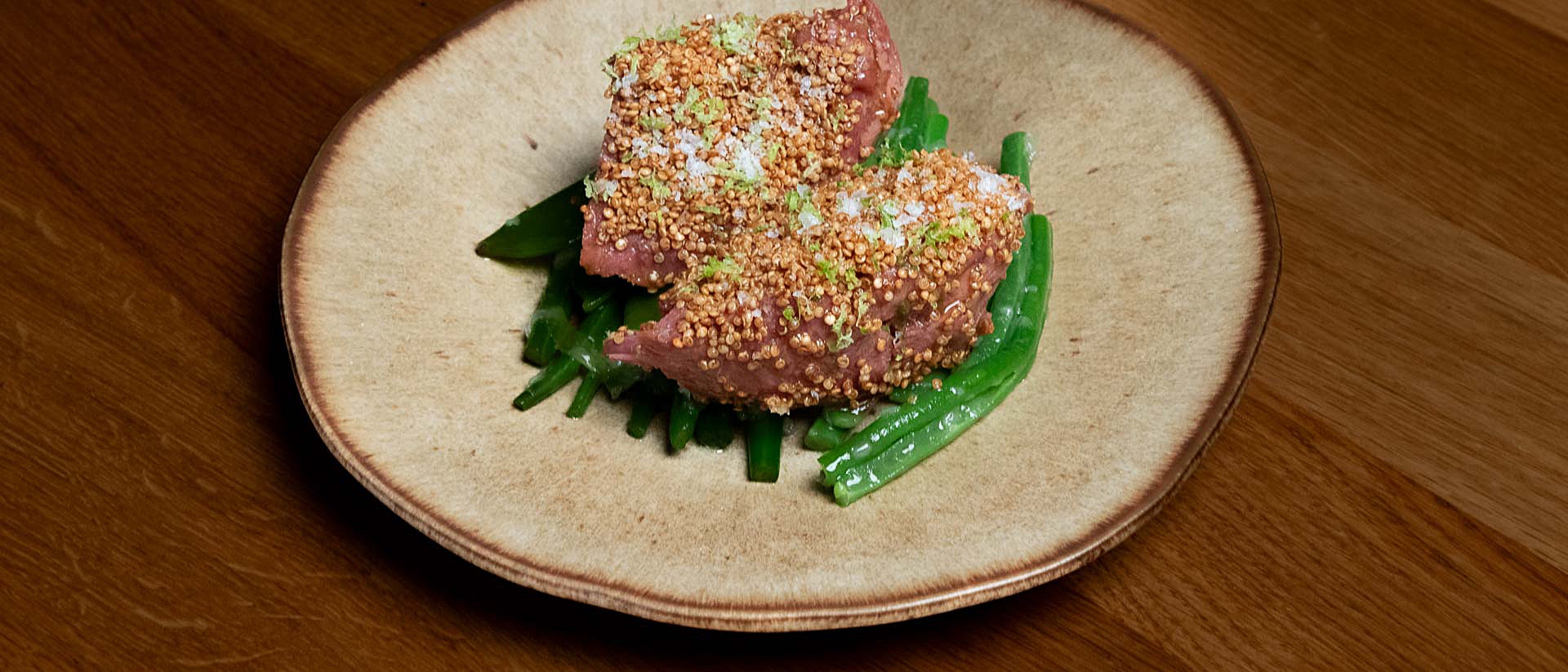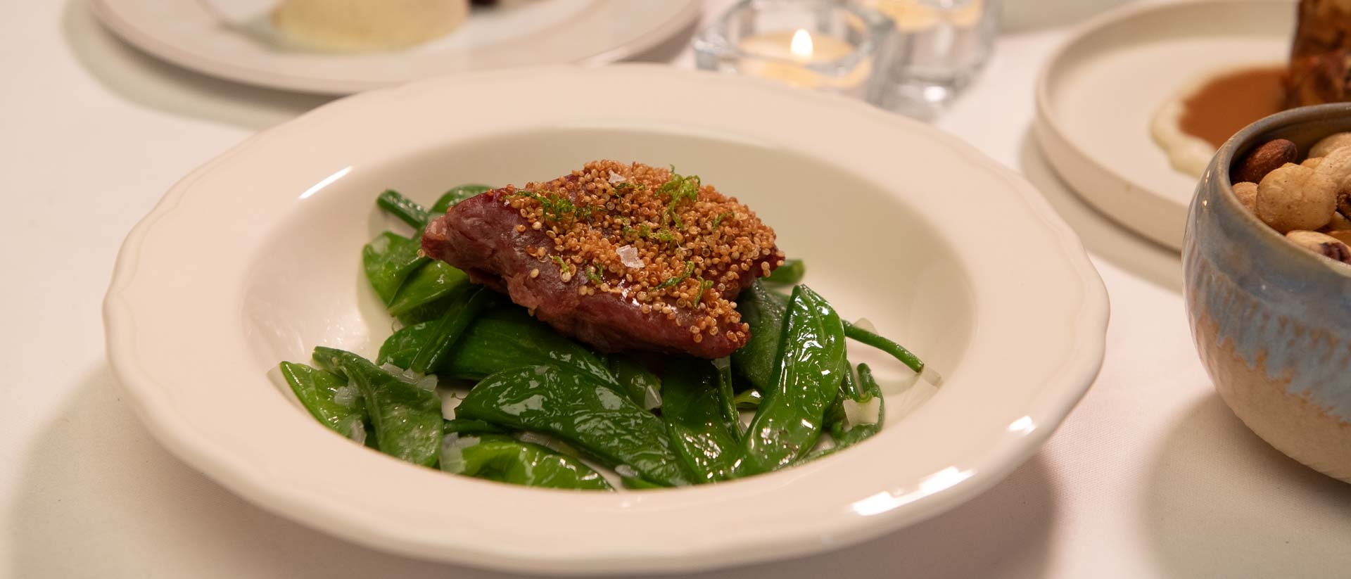 - Lamsnek met pastinaakcrème, gepofte quinoa, groentes, lamsjus en sjalotboter
