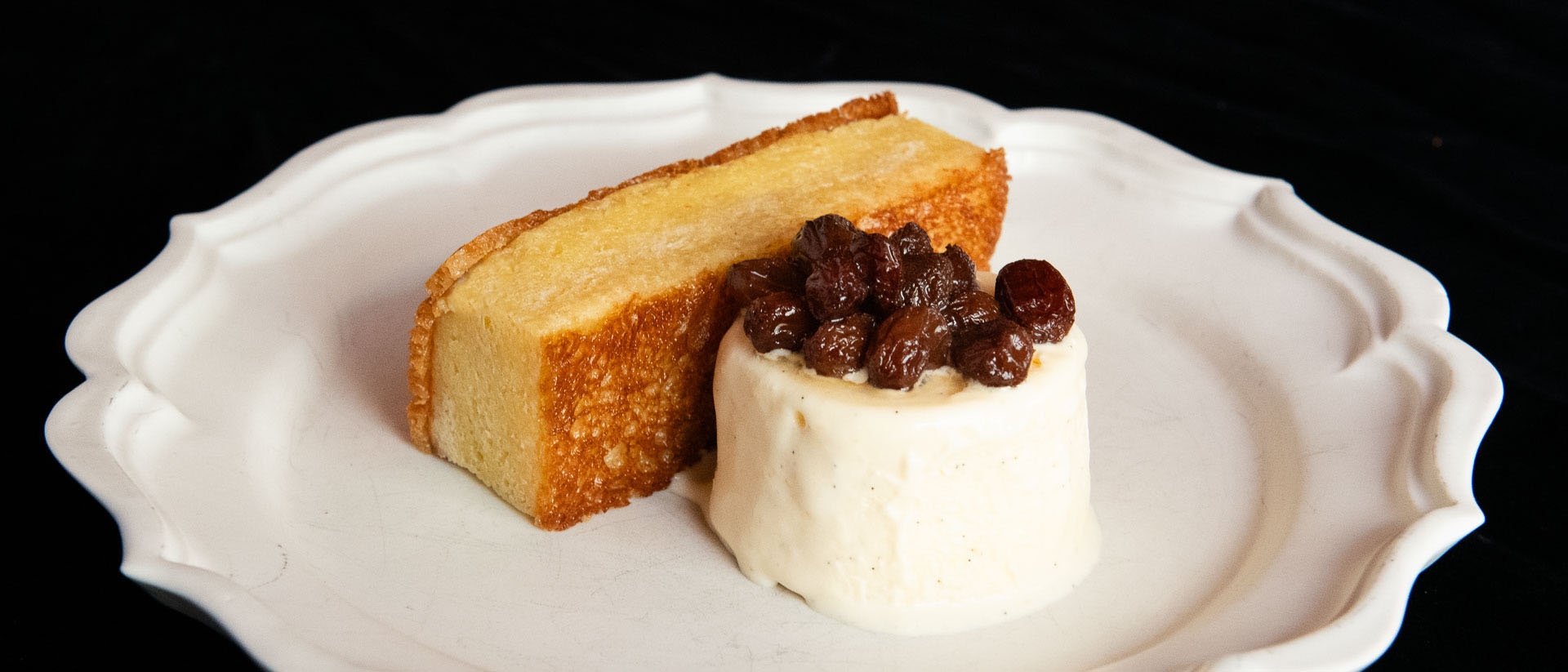 - Bread and butter pudding van komijn met ingelegde rozijnen en parfait van gerookt vanille-ijs