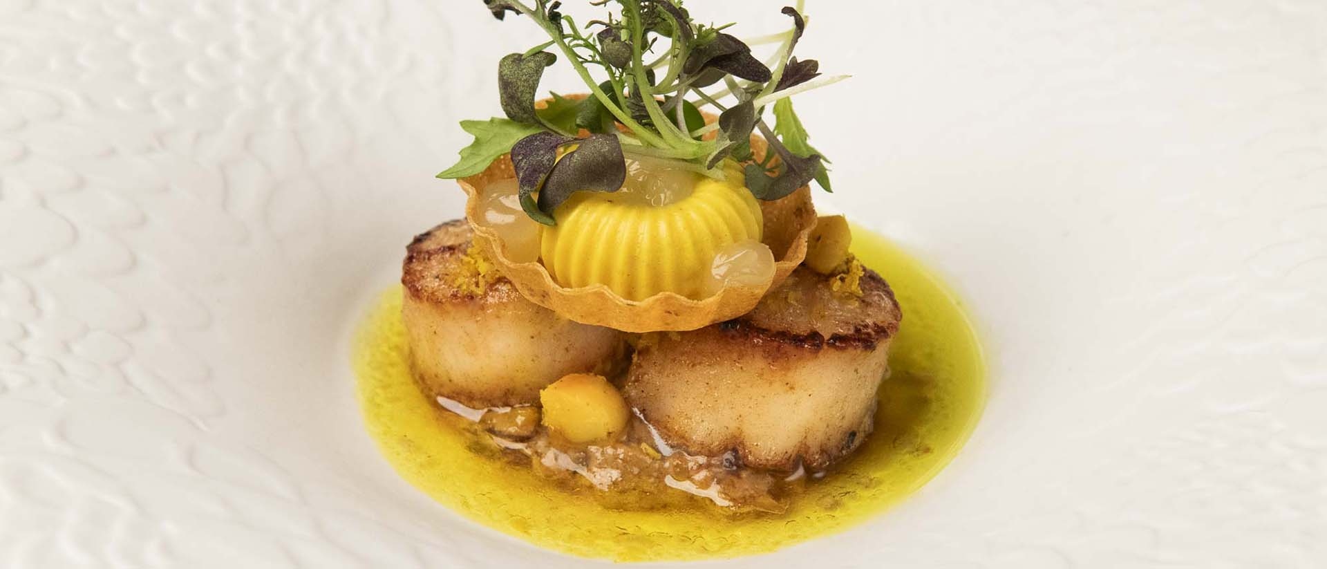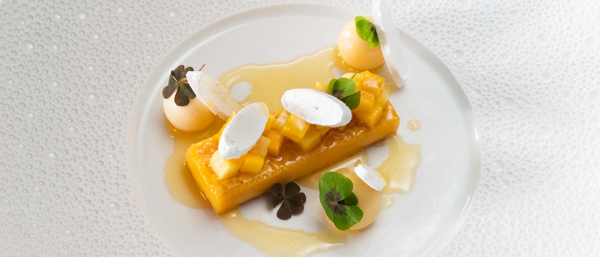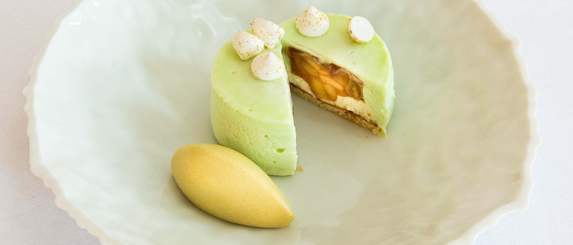 De Groene Lantaarn** - Taartje van yuzu met mango en kokos-crèmeux