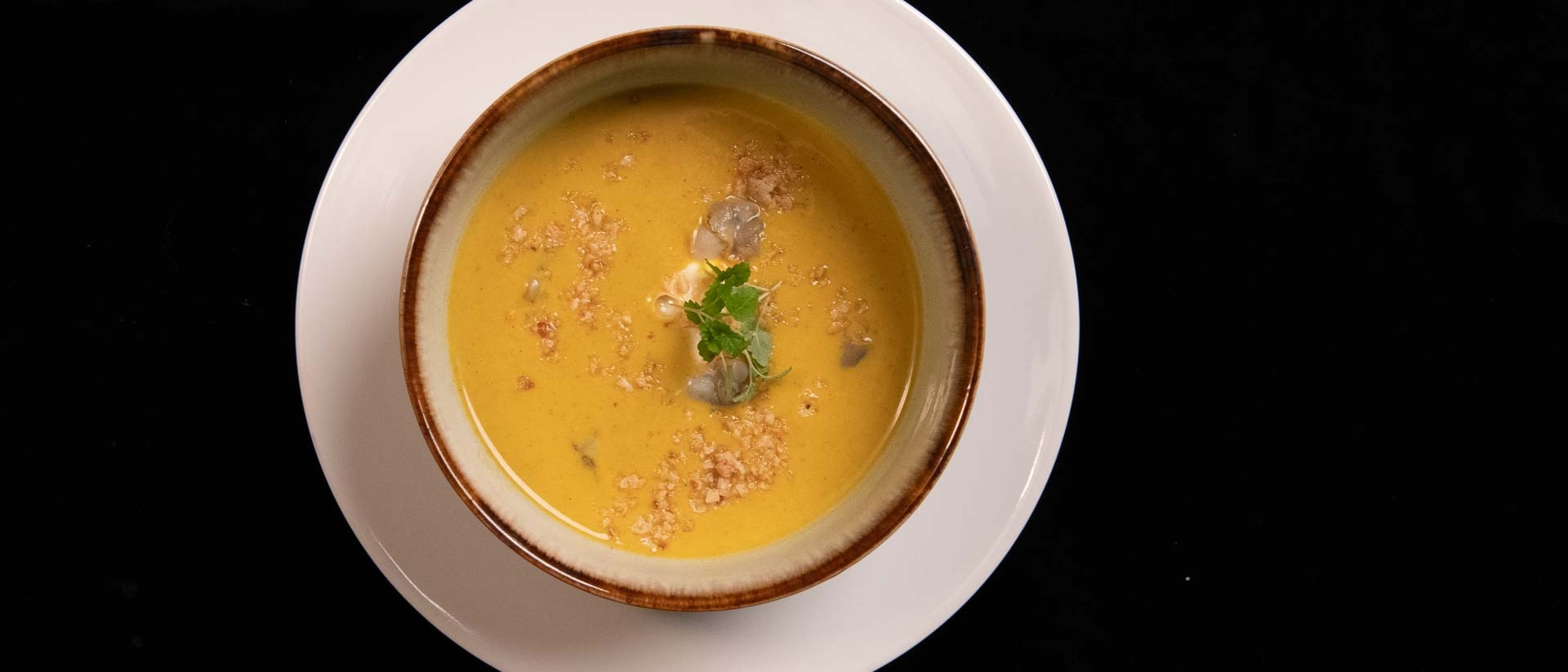 - Kokos-masalasoep met crème fraiche, kokkels, péjé-krokant en melissa cress