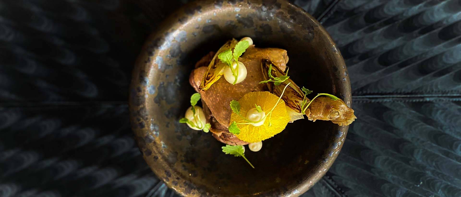 - Bresse Kip ravioli, langoustine, bospaddenstoelen, kreeftensaus