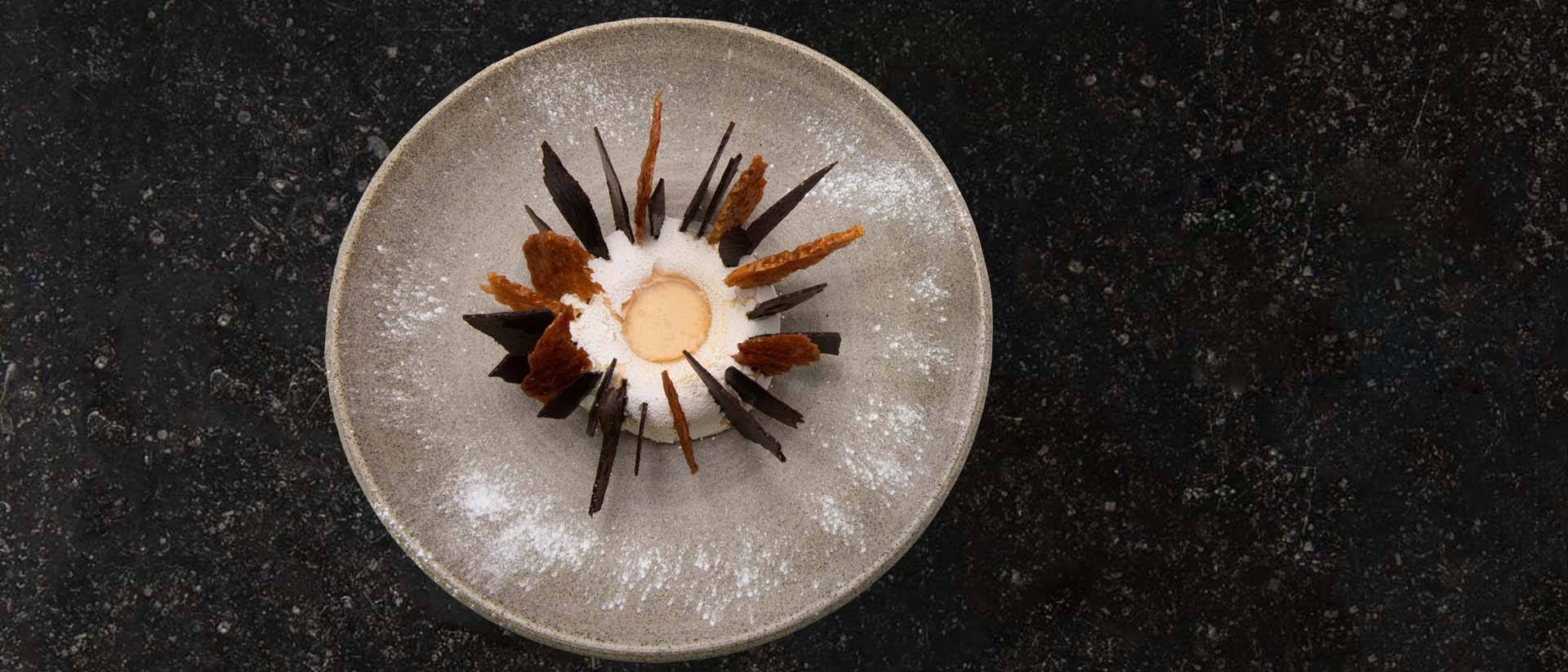 - Tartelette met advocaat, banaan caramel, merengue, mangovinaigrette en blauwe bes